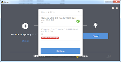 - Click the Select drive button in Etcher. If the program detects more than one potential external drive it will give you a choice. Be sure to choose the card reader containing your 64GB microSD card, and then click Continue.